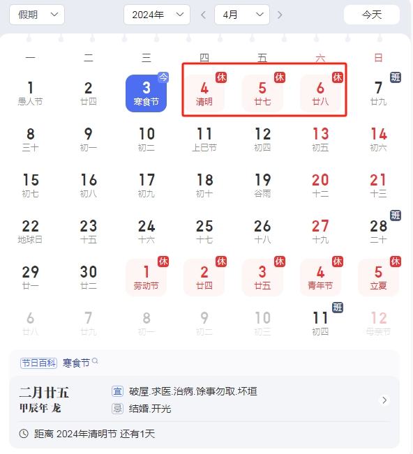 2024年清明節放假時間安排: 4月4日(星期四)至4月6日(星期六)放假調休,共3天。4月7日(星期日)上班。