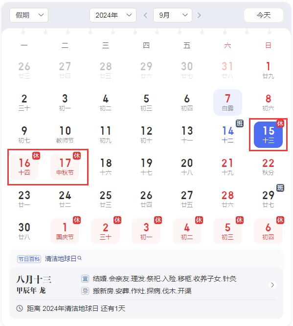 2024年中秋節放假時間安排: 9月15日(星期日)至7月17日(星期二)放假調休,共三天。9月18日(星期三)上班。